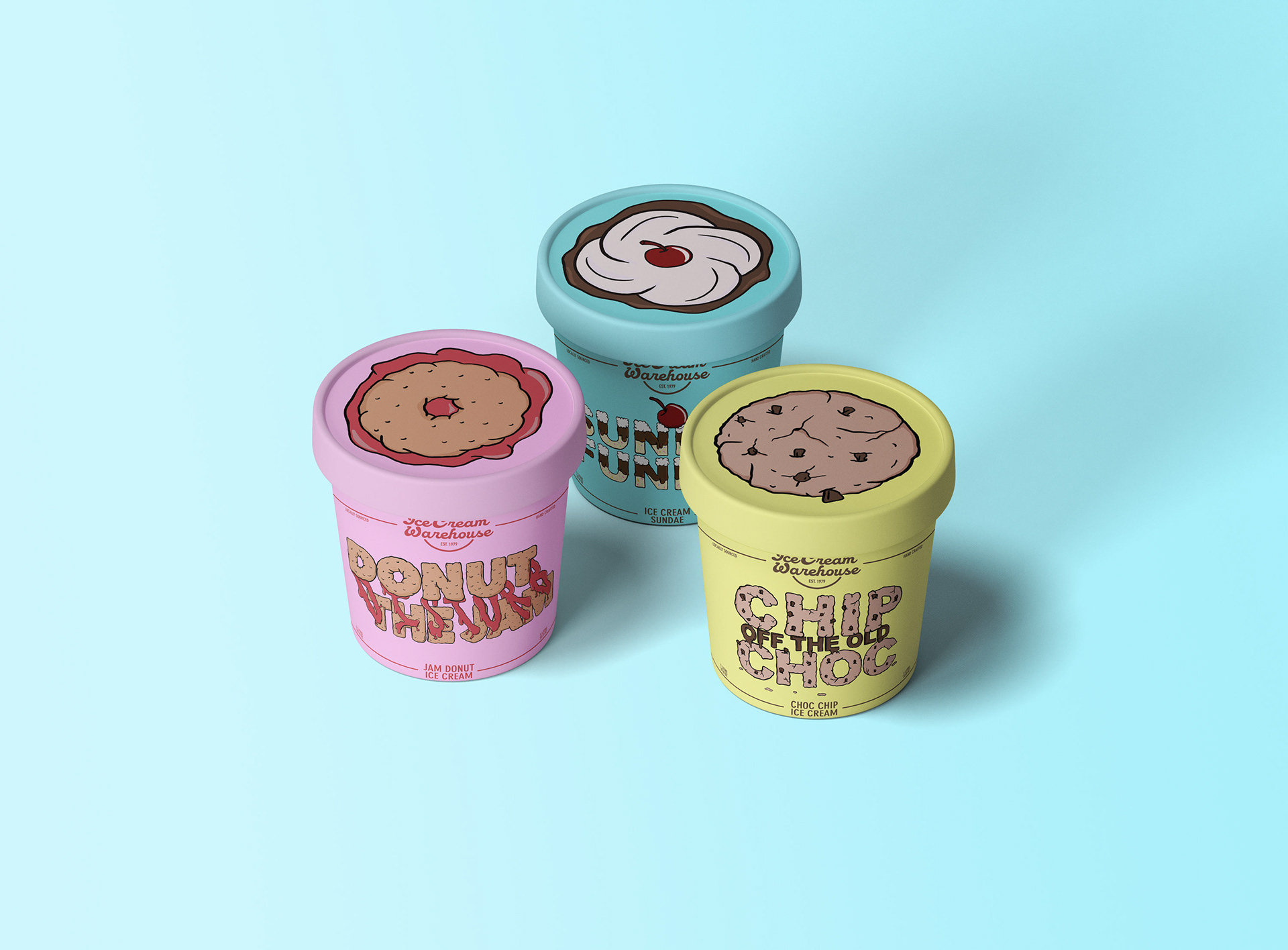 Packaging and branding highlighting the quirky and playful flavours of Ice Cream Warehouse.