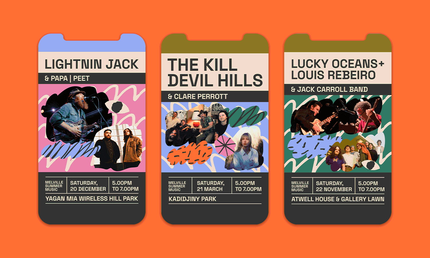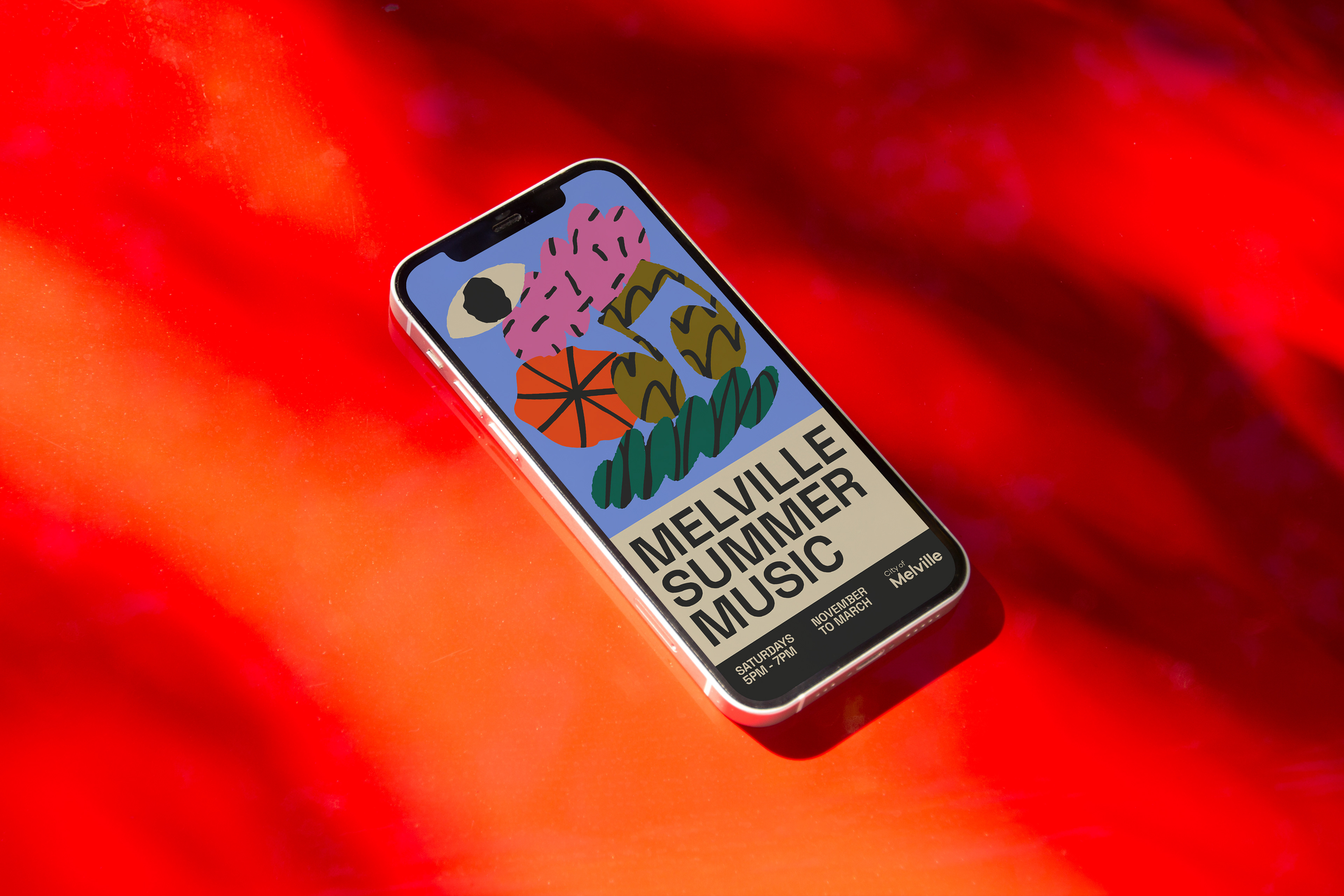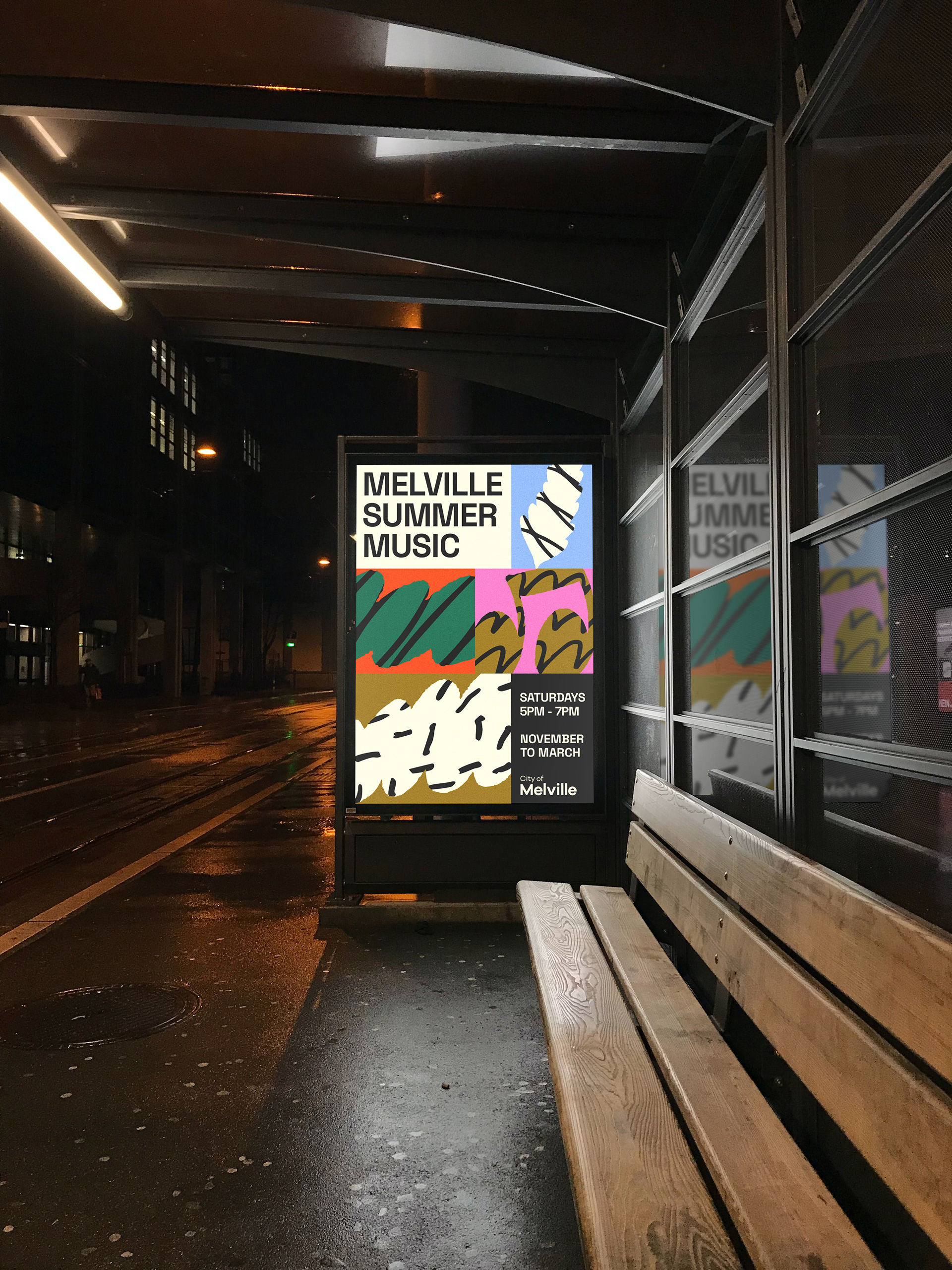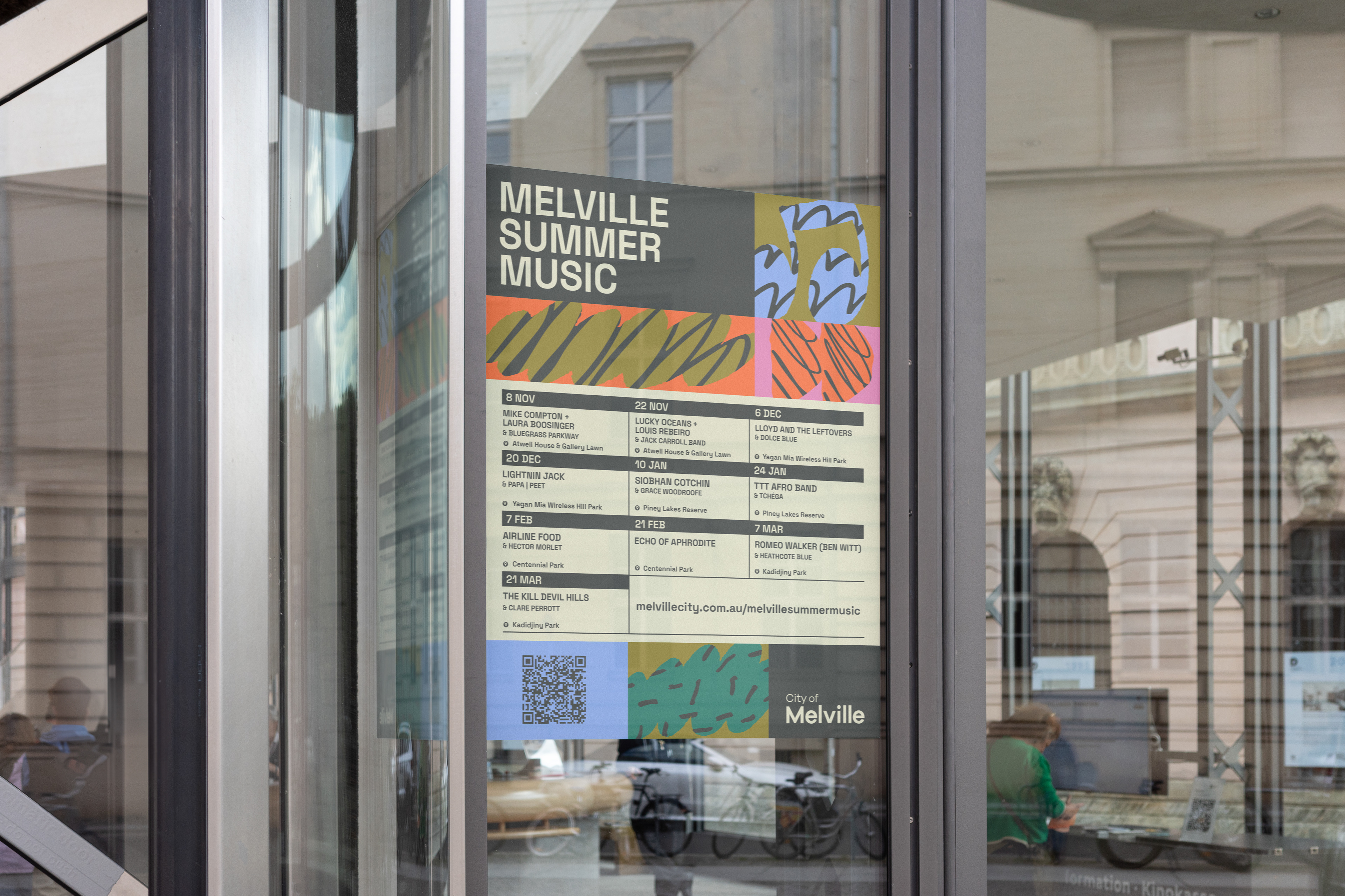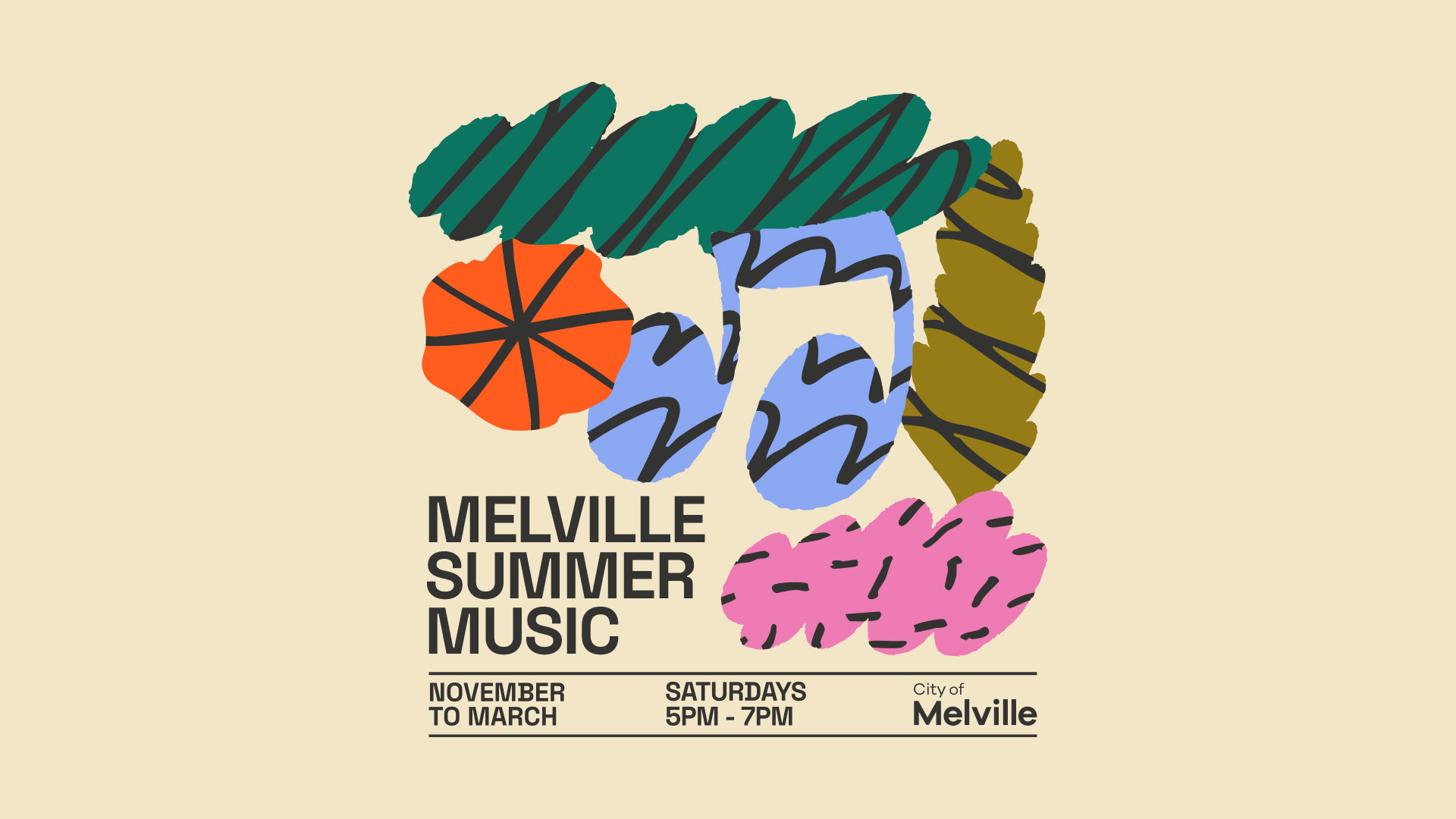Event identity design for the City of Melville’s “Melville Summer Music,” a free, all‑ages concert series running through summer 25–26. The brand leans into bright, playful